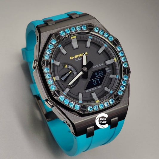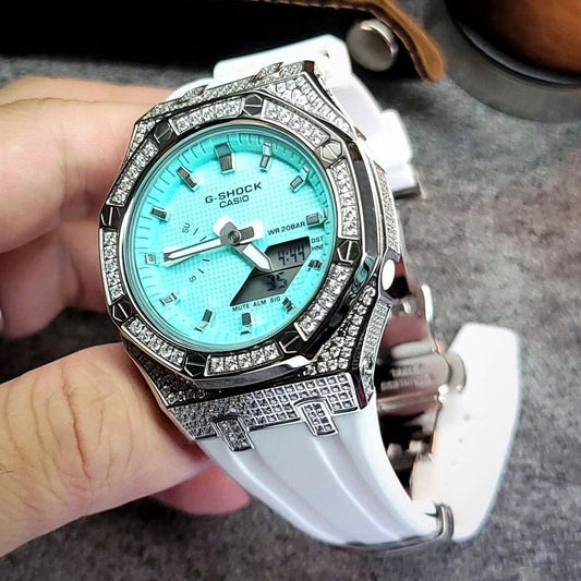 Glänzen Sie mit unseren Diamond Case G-Shock Casioak Mods. Diese Uhren sind mit präzise geschliffenen Diamanten verziert und machen sie zu einem glamourösen Accessoire für jede Veranstaltung.