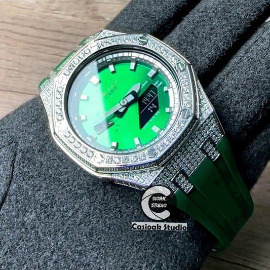 Casioak Mod Uhr Diamant Silber Gehäuse Grünes Armband Silberne Zeitmarkierungen Grüne Zifferblätter 44mm Geschenk