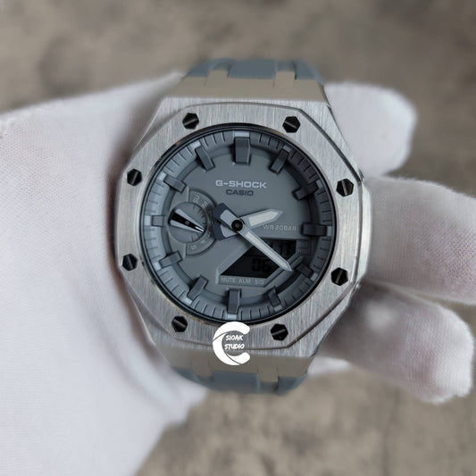 Casioak Mod Uhr Silbergehäuse Graues Kautschukarmband Hellgraue Zeitmarkierungen Graue Zifferblätter 44mm Grau