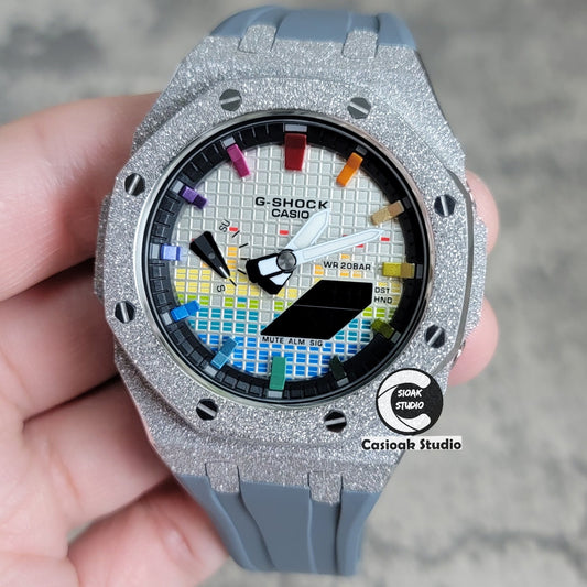 Casioak Mod Uhr Gefrostetes Silbergehäuse Graues Armband Schwarze Regenbogen-Zeitmarkierungen Musik-Zifferblätter 44mm
