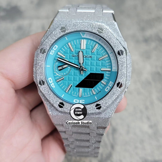 Casioak Mod Uhr NEU Mattiertes Silbergehäuse Metallarmband Tiff Silber Zeitmarkierung Tiff Blaue Zifferblätter 44mm
