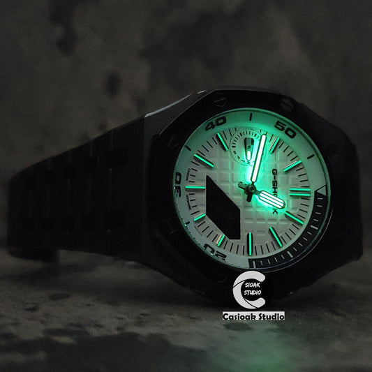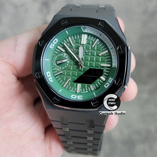 Casioak Mod Uhr Neue polierte graue Gehäuse Metallarmband grüne Zeitmarkierung grüne Zifferblätter 44mm