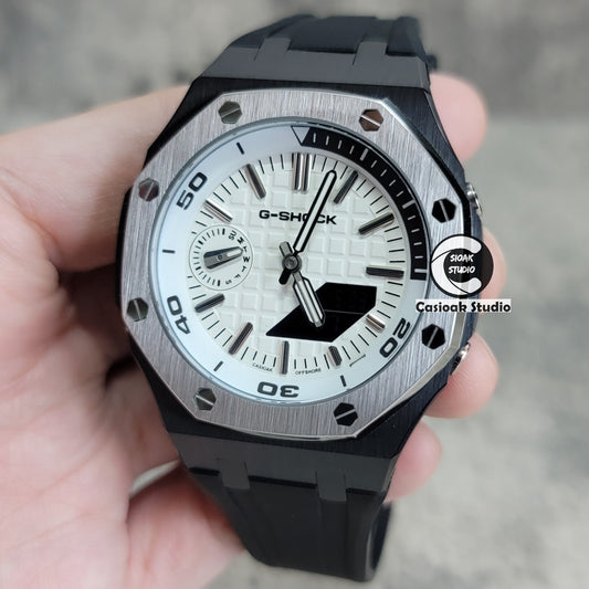 Casioak Mod Uhr Neu Silber Schwarzes Gehäuse Schwarzes Gummiband Silberne Zeitmarkierungen Weiße Zifferblätter 44mm