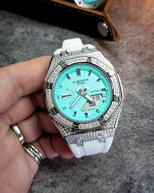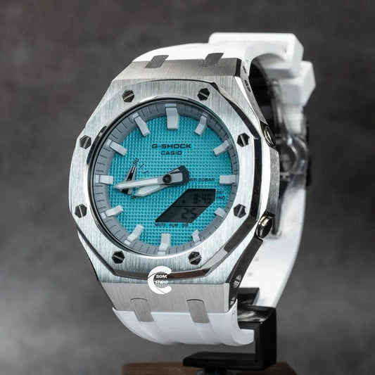 Casioak Mod Uhr Silbergehäuse Weißes Kautschukarmband Hellgraue Weiße Zeitmarkierungen Tiff Blau Zifferblätter 44mm