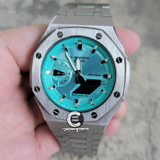Casioak Mod Uhr Neue polierte silberne Gehäuse Metallarmband Silberne Zeitmarkierungen Tiff Blau Zifferblätter 44mm