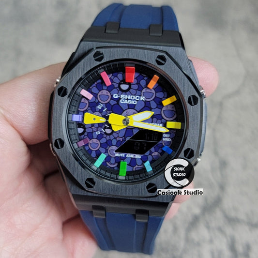Casioak Mod Offshore Superior Schwarzes Gehäuse Blauer Kautschukarmband Schwarze Rainbow Time Mark Takashi Murakami Zifferblätter 44mm