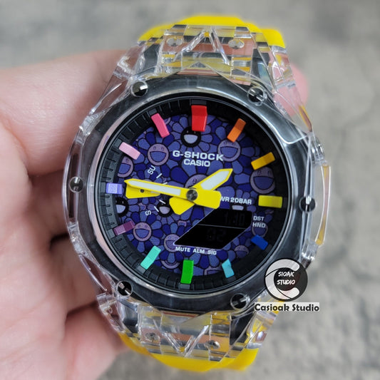 Casioak Mod Uhr Transparentes Gehäuse Gelbes Armband Schwarze Regenbogen-Zeitanzeige Lila Takashi Murakami Zifferblätter 44mm