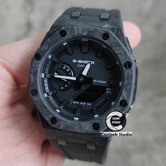 Casioak Mod Uhr Kohlefaser Überlegen Schwarzes Gehäuse Schwarzes Armband Schwarze Graue Zeitmarkierung Schwarze Zifferblätter 44mm