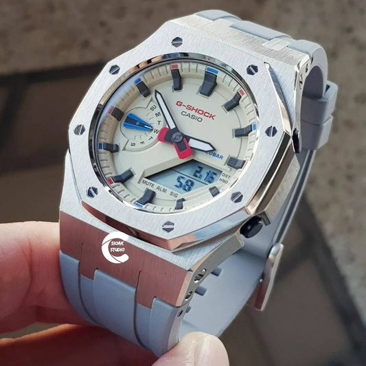 Horloĝo Casioak Mod, arĝenta kazo, blanka kaŭĉuka rimeno, blanka nigra temposigno, blankaj ciferplatoj, 42mm