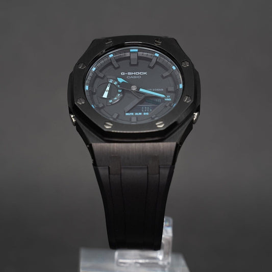 Horloĝo Casioak Mod kun nigra kazo, nigra kaŭĉuka rimeno, blua tempomarko, bluaj ciferplatoj, 44mm