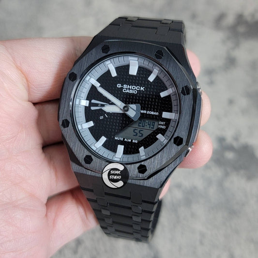 Horloĝo Casioak Mod kun polurita nigra kazo, metala rimeno, nigra temposigno, nigraj ciferplatoj, 44mm