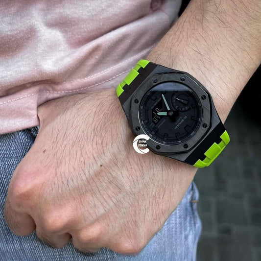Horloĝo Casioak Mod kun nigra kazo, verda kaŭĉuka rimeno, nigra temposigno, nigraj ciferplatoj, 44mm