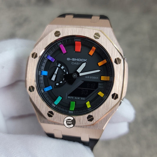 Horloĝo Casioak Mod kun rozora kazo, nigra kaŭĉuka rimeno, nigra ĉielarka temposigno, nigraj ciferplatoj, 44mm