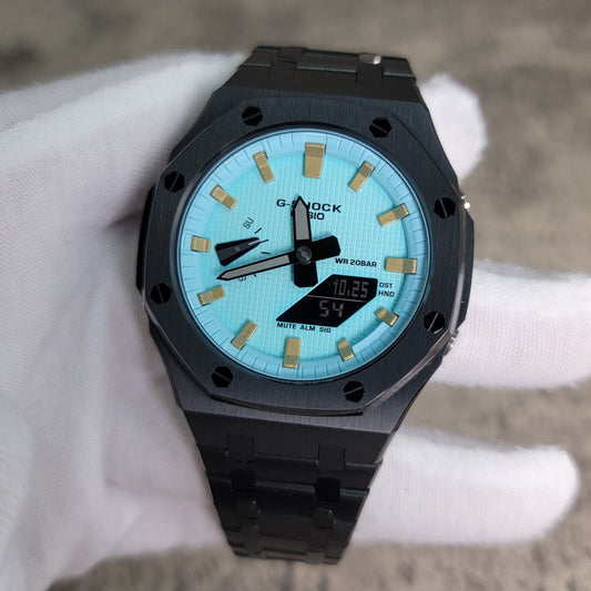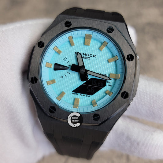 Horloĝo Casioak Mod kun nigra kazo, nigra kaŭĉuka rimeno, ora tempomarkilo Tiff, bluaj ciferplatoj, 44mm