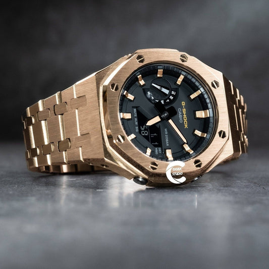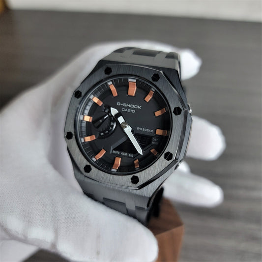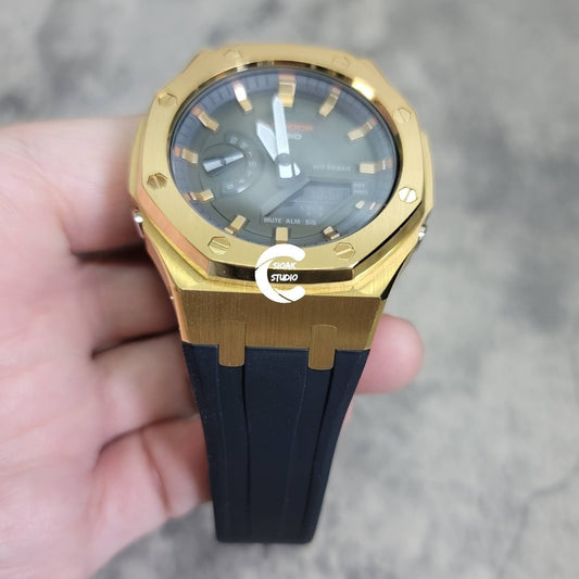 Horloĝo Casioak Mod kun ora kazo, nigra kaŭĉuka rimeno, nigraj oraj tempomarkiloj, ciferplatoj 44mm