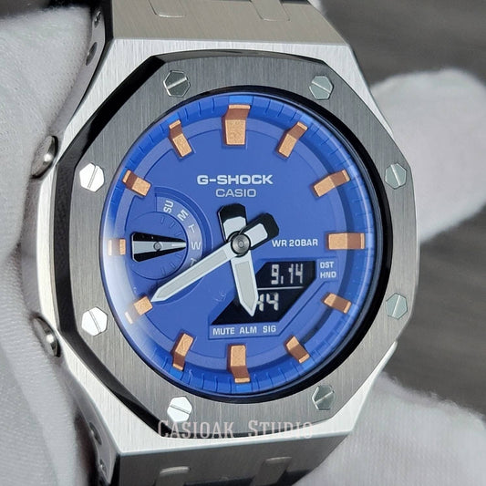 Horloĝo Casioak Mod kun polurita arĝenta kazo, metala rimeno, ora tempomarko, bluaj ciferplatoj, 44mm