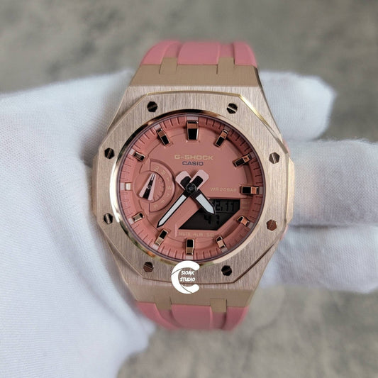 Horloĝo Casioak Mod kun rozora kazo, rozkolora kaŭĉuka rimeno, rozkolora ora temposigno, rozkoloraj ciferplatoj, 42mm