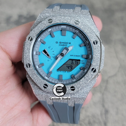 Montre Mod Casioak Boîtier Argent Givré Bracelet Gris Cadrans Gris Marqueurs de Temps Bleu Tiffany 44mm