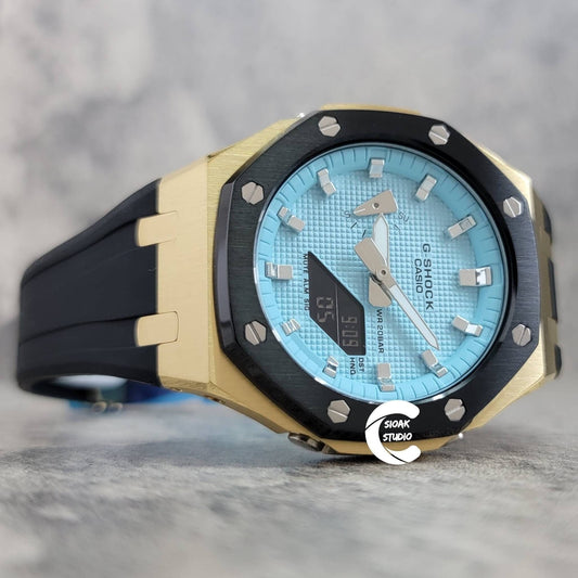 Montre Mod Casioak Boîtier Noir Doré Bracelet Caoutchouc Noir Marqueurs de Temps Noir Doré Cadrans Bleu Tiff 44mm