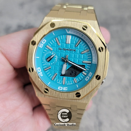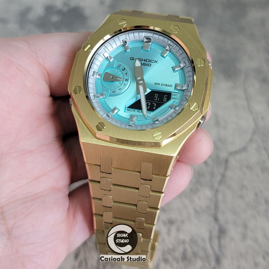 Montre Mod Casioak Boîtier Or Bracelet Métal Marqueurs Argent Cadrans Bleu Tiffany 44mm