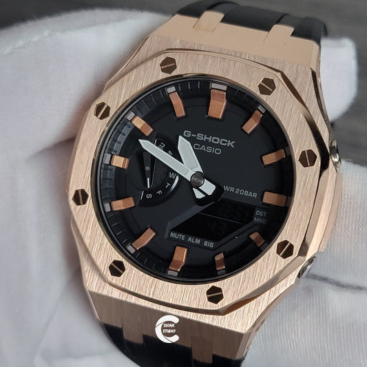 Montre Casioak Mod Boîtier Or Rose Bracelet Caoutchouc Noir Marque-temps Or Rose Noir Cadrans 44mm