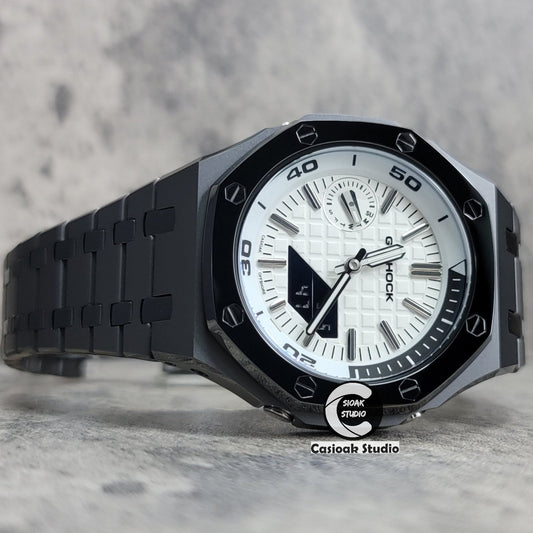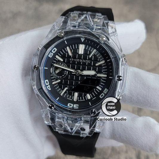 Casioak Mod NOUVEAU Boîtier Transparent Bracelet Noir Marqueurs de Temps Argent Cadrans Blancs 44mm