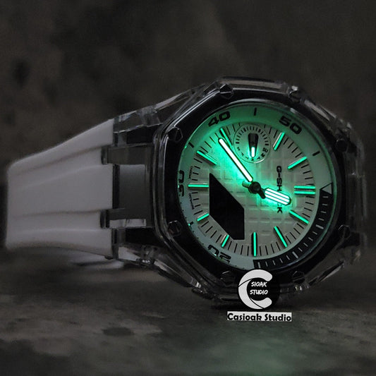 Casioak Mod NOUVEAU Boîtier Transparent Bracelet Blanc Marqueurs de Temps Argent Cadrans Blancs 44mm