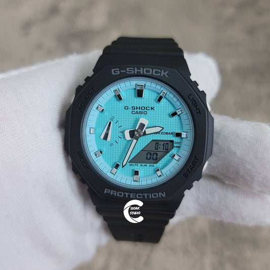 Montre Mod Casioak Boîtier en plastique noir Bracelet blanc Tiff Marqueurs de temps Tiff Cadrans bleus 42mm