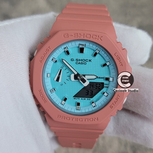Montre Casioak Mod Boîtier Rose Bracelet Plastique Marque-temps Argent Tiff Cadrans Bleus Tiff 42mm