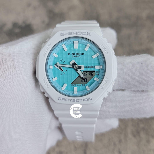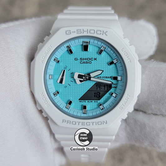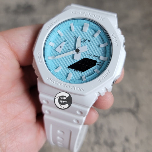 Montre Mod Casioak Boîtier Blanc Bracelet Plastique Blanc Tiff Marque Temps Cadrans Bleu Tiff 42mm