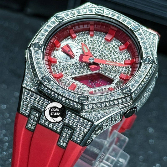 Montre Mod Casioak Boîtier Argent Diamant Bracelet Rouge Marqueurs de Temps Rouges Cadrans Diamant 44mm