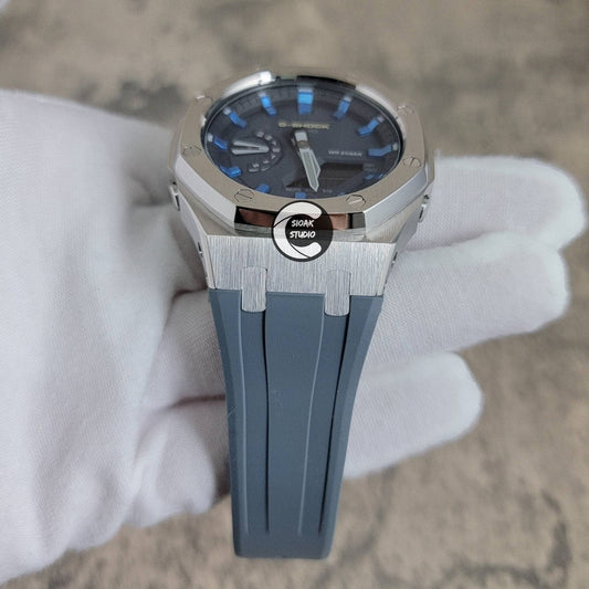 Montre Casioak Mod Boîtier Argent Bleu Bracelet Caoutchouc Gris Cadrans Bleus Marqueurs Bleus 44mm