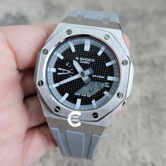 Brillez avec nos mods Silver Case G-Shock Casioak. Élégantes et intemporelles, ces montres complètent sans effort n'importe quelle tenue, faisant une déclaration subtile mais percutante.