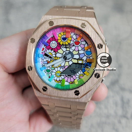 Montre Casioak Mod Boîtier Or Rose Bracelet Métal Cadrans Arc-en-ciel Marque-temps Takashi Murakami 44mm