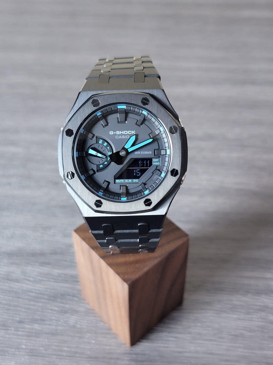 Casioak モッドウォッチ ブラックケース メタルストラップ ブラックタイムマーク ブラックダイヤル 44mm ブルー
