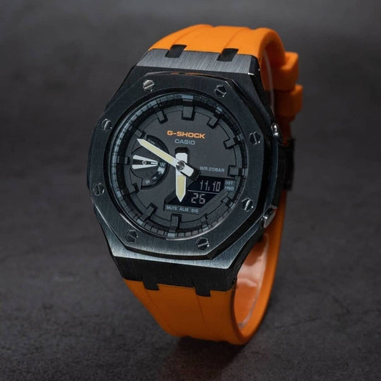 Casioak モッドウォッチ ブラックケース オレンジラバーストラップ ブラックゴールドタイムマーク ブラックダイヤル 44mm