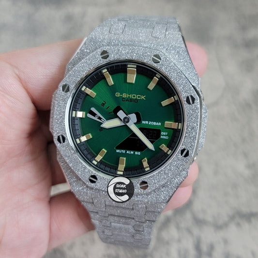 Casioak モッドウォッチ フロストシルバーケース メタルストラップ シルバータイムマーク グリーンダイヤル 44mm