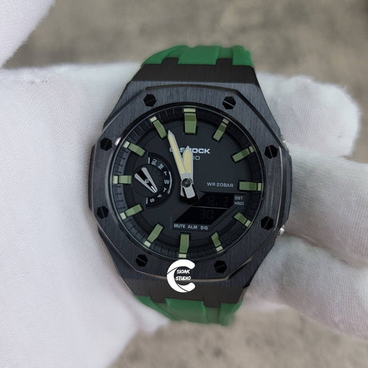 Casioak モッドウォッチ ブラックケース グリーンラバーストラップ ブラックシルバータイムマーク グリーンダイヤル 44mm