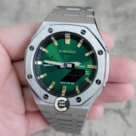 Casioak モッド シルバーケース メタルストラップ ブラック ゴールド タイムマーク グリーンダイヤル 44mm