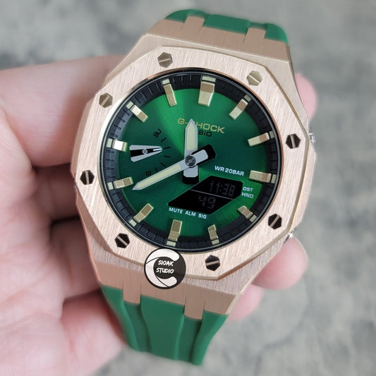 Casioak モッド ローズゴールドケース メタルストラップ ブラックゴールドタイムマーク グリーンダイヤル 44mm