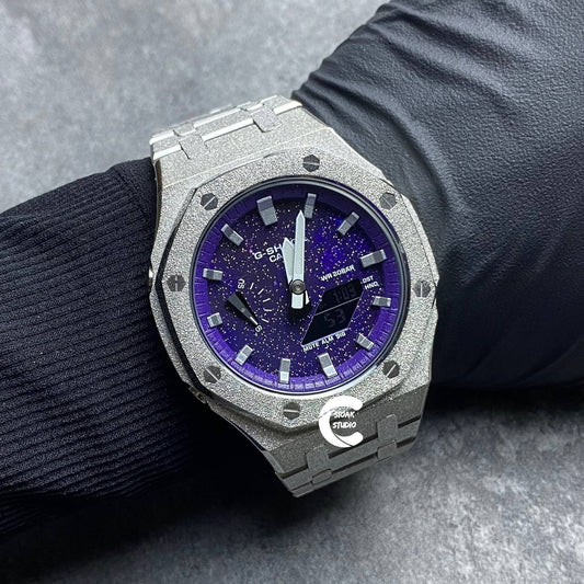 Casioak モッドウォッチ フロステッドシルバーケース メタルストラップ パープルシルバータイムマーク パープルダイヤル 44mm