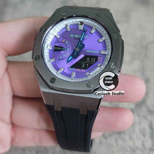 Casioak モッド グレーケース ブラックラバー シルバータイムマーク パープルダイヤル 44mm
