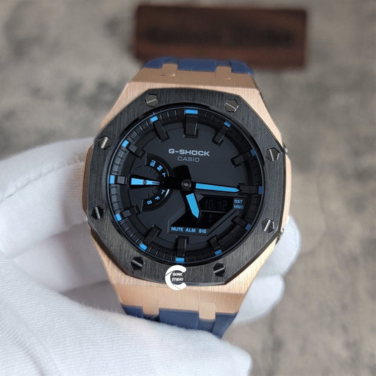 Casioak モッドウォッチ ローズゴールドケース ブルーラバーストラップ ブラックライトグレータイムマーク ブラックダイヤル 44mm