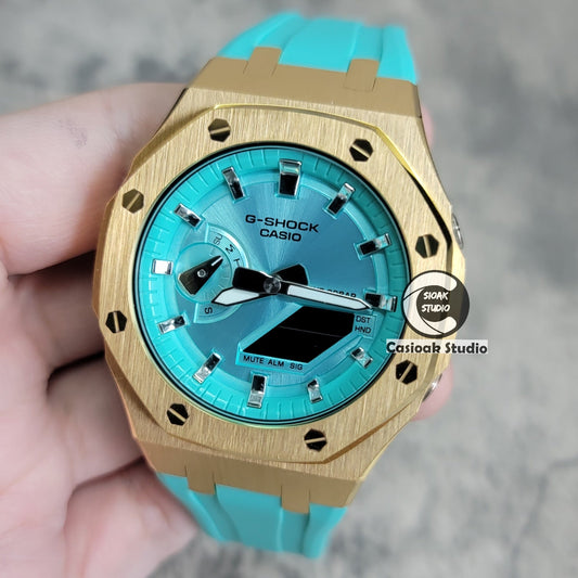 Zegarek Casioak Mod z różowo-złotą kopertą, czarnym gumowym paskiem, niebieskimi znacznikami czasu Tiffany, niebieskimi tarczami Tiffany, 44 mm