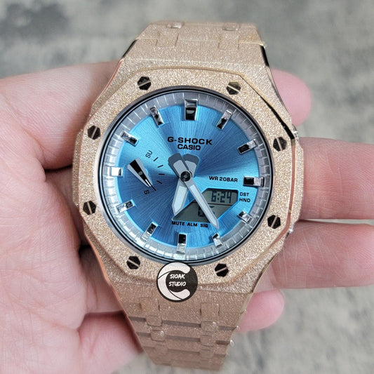 Zegarek Casioak Mod Koperta w kolorze różowego złota Pasek metalowy Różowe złoto Wskazówki czasu Niebieskie tarcze 44mm