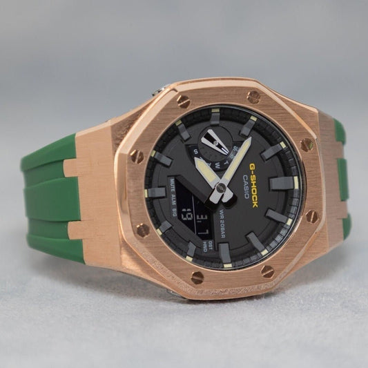 Zrób wrażenie dzięki naszym złotym modyfikacjom G-Shock Casioak. Te zegarki emanują przepychem, łącząc trwałość z nutą luksusu.