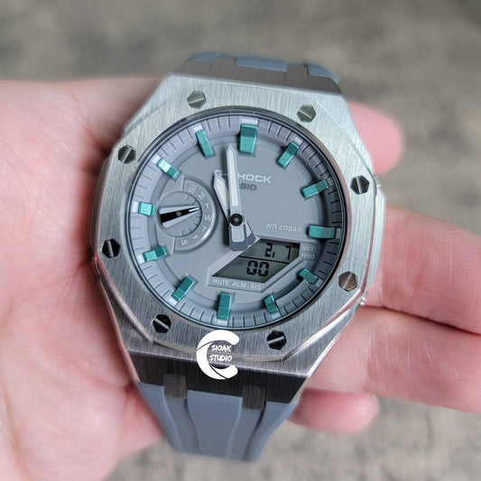 Zegarek Casioak Mod Srebrna Koperta Szary Pasek Gumowy Jasnoszary Turkusowe Znaczniki Czasu Szare Tarcze 44mm