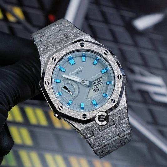 Zegarek Casioak Mod z matową srebrną kopertą, metalową bransoletą, szaro-niebieskimi wskazówkami czasu, szarymi tarczami, 44 mm, szary
