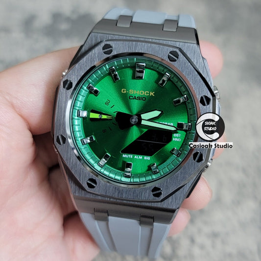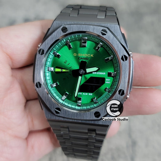 Casioak Mod Zegarek Nowa Polerowana Szara Koperta Metalowy Pasek Zielone Znaczniki Czasu Zielone Tarcze 44mm