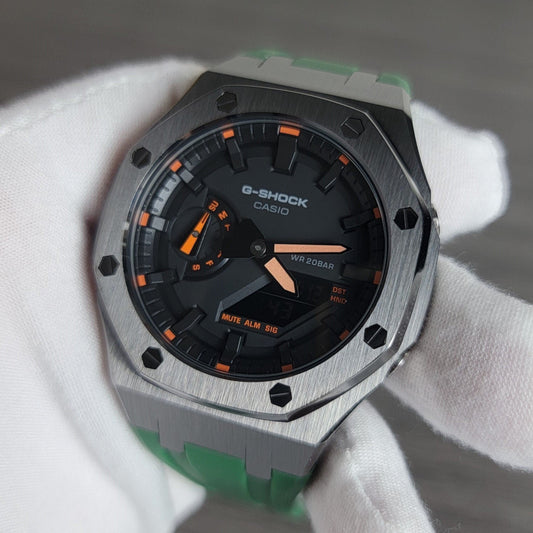 Upptäck den perfekta balansen mellan robust och elegant med våra Gunmetal Case G-Shock Casioak-mods. Dessa klockor utstrålar en kantig sofistikering som sticker ut i varje folkmassa.